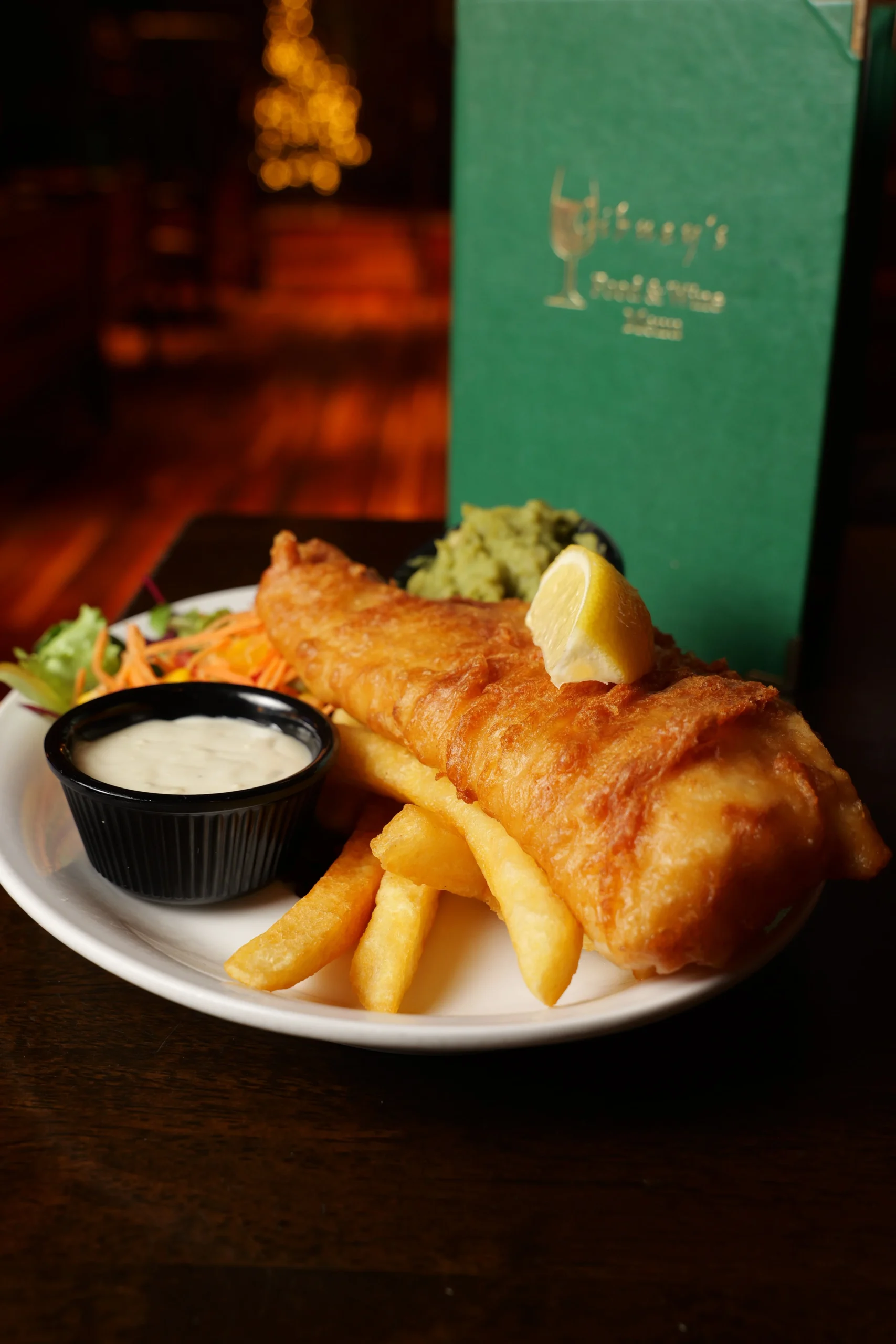 Fillet of Cod deep fried in a Beer Batter with Chips, Mushy Peas & Tartare Sauce (1/2/3/4/14)