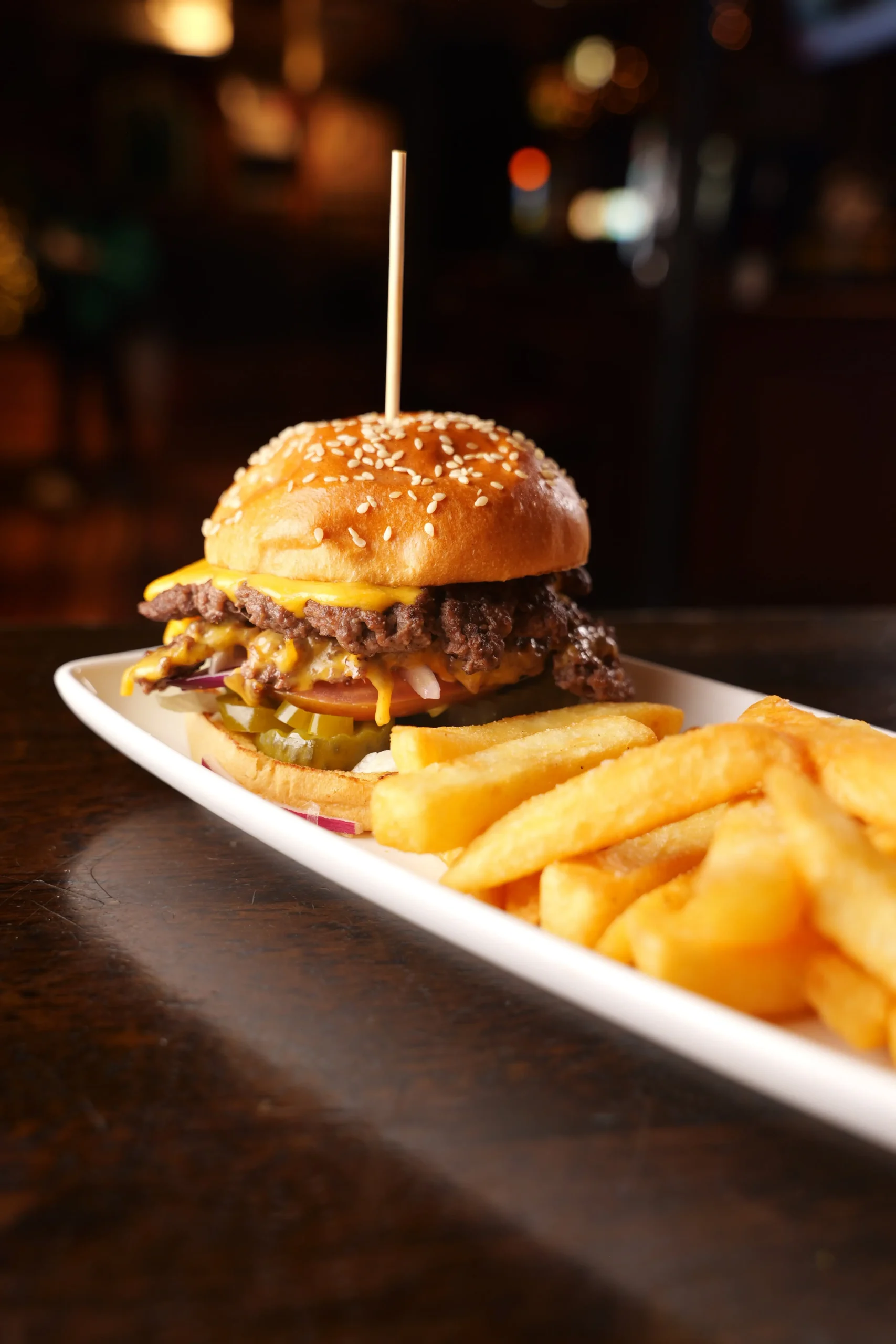 A juicy burger served with a side of freshly prepared chips.